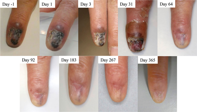 在黑色素瘤治疗方面,2023年日本研究人员报告了一例肢端皮肤恶性黑色素瘤患者的报告,该患者肿瘤大小为20 × 12mm,患者接受治疗后肿瘤开始缓慢的缩小,颜色也逐渐变淡,在第183天达到部分缓解(PR),并在第365天达到完全缓解(CR)。