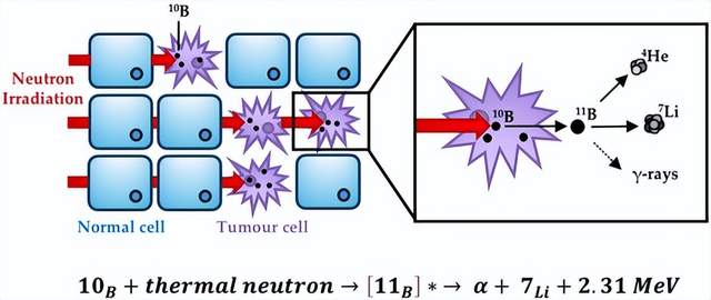 当硼元素在肿瘤细胞内积累到足够浓度时,医生用中子束对肿瘤部位进行照射。这时,硼原子会捕获中子,发生核反应,释放出高能粒子。这些粒子射程极短,仅相当于一个细胞的直径,从而能精准破坏癌细胞,而周围健康组织几乎不受影响。