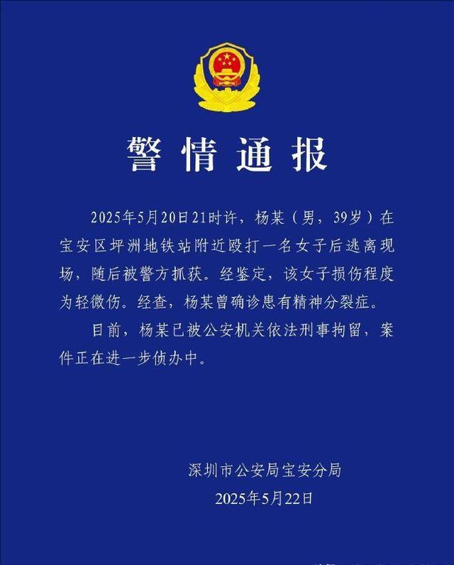 通报显示,施暴者杨某曾确诊患有精神分裂症。