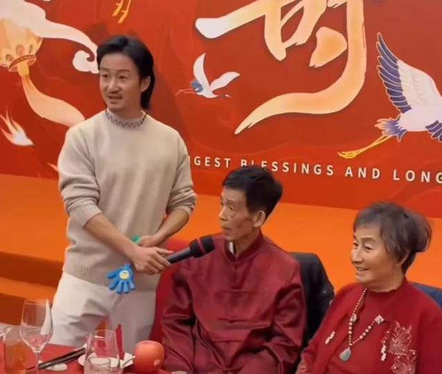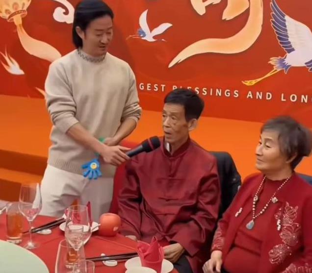 吴京则拿着话筒发表感言,感谢亲朋好友的到来,还手拿话筒放在父亲嘴边,让父亲这个寿星说话,可以说非常的贴心了。