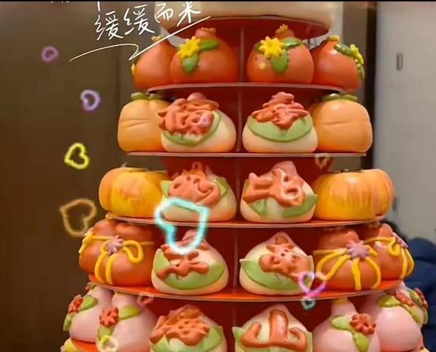 吴京为父亲准备的寿桃也很有讲究,每一个寿桃都不一样,寿桃上还用面粉做成了福如东海寿比南山的文字,最上面的那个寿桃则是最正常的寿桃模样,粉色的寿桃躺在金色叶子装饰的盘子里,寿桃上面还有一尾跃起的金鱼,寓意非常好。