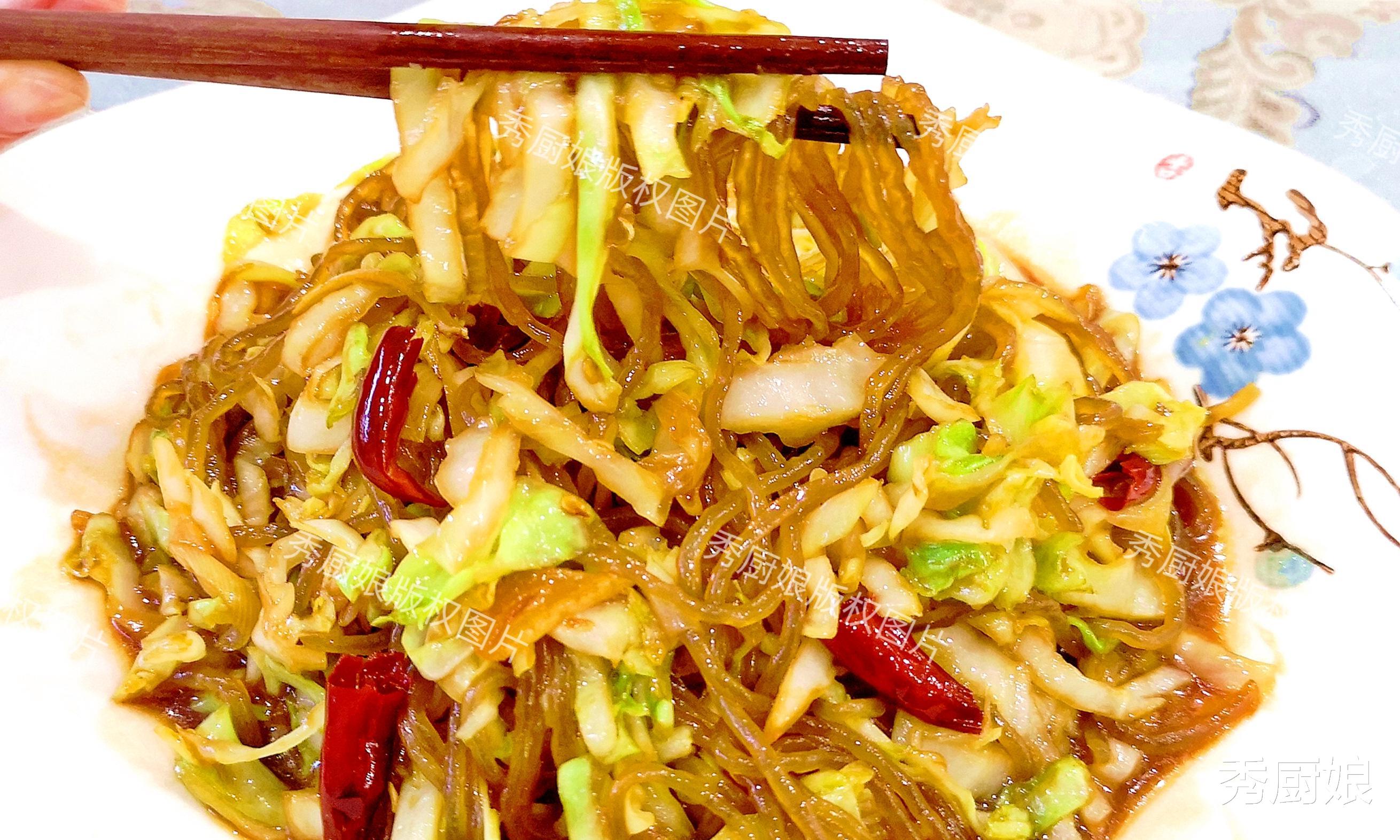 3. 加入泡好的粉条,翻炒几分钟至粉条吸收汤汁,软糯入味,最后加盐、鸡精调味,出锅前撒上一点蒜末提香。