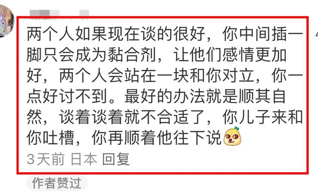 但也有人认为:“越是这样一开始就应该对儿子明确表示不同意,快刀斩乱麻。千万别想着顺其自然,时间一长感情深了,后患更多。”