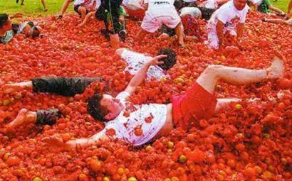 4.西班牙番茄大战节 番茄节始于1945年,每年8月的最后一个星期三在巴伦西亚省的小镇布尼奥尔举行,这也是这个小镇一年最疯狂的时刻!
