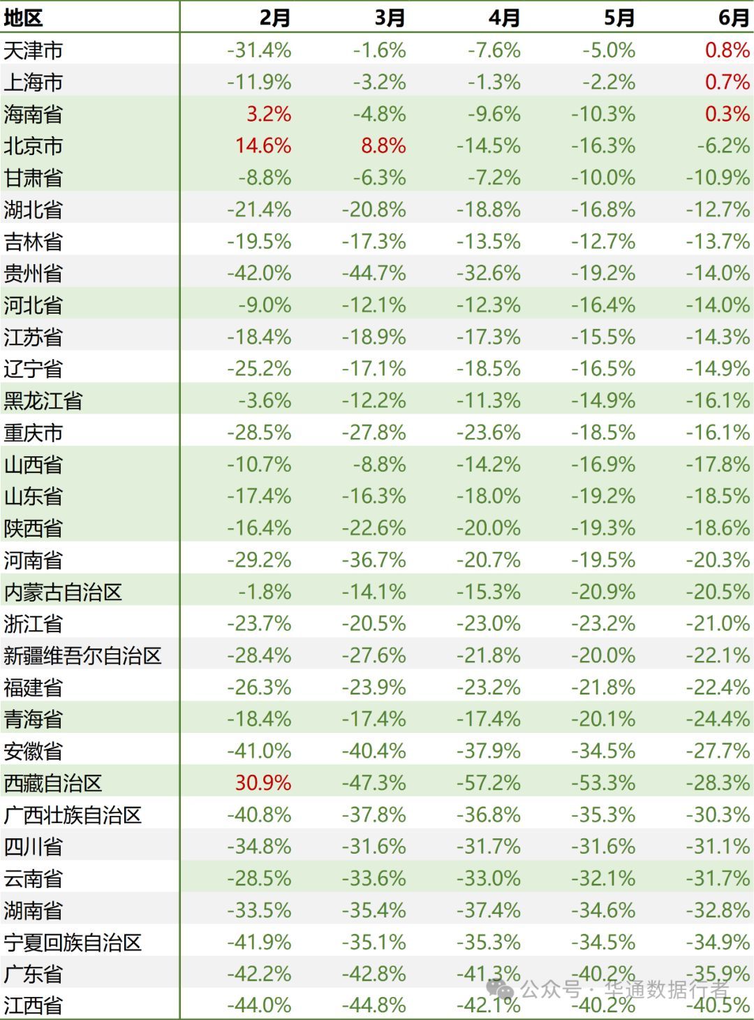而各省的情况来看,有19个省级行政区划的商品住宅销售面积累计值从2月到6月的同比跌幅是扩大的。跌幅收窄的省级行政区划也只有天津市、上海市和海南省又跌转涨,其他依然是一片绿油油。