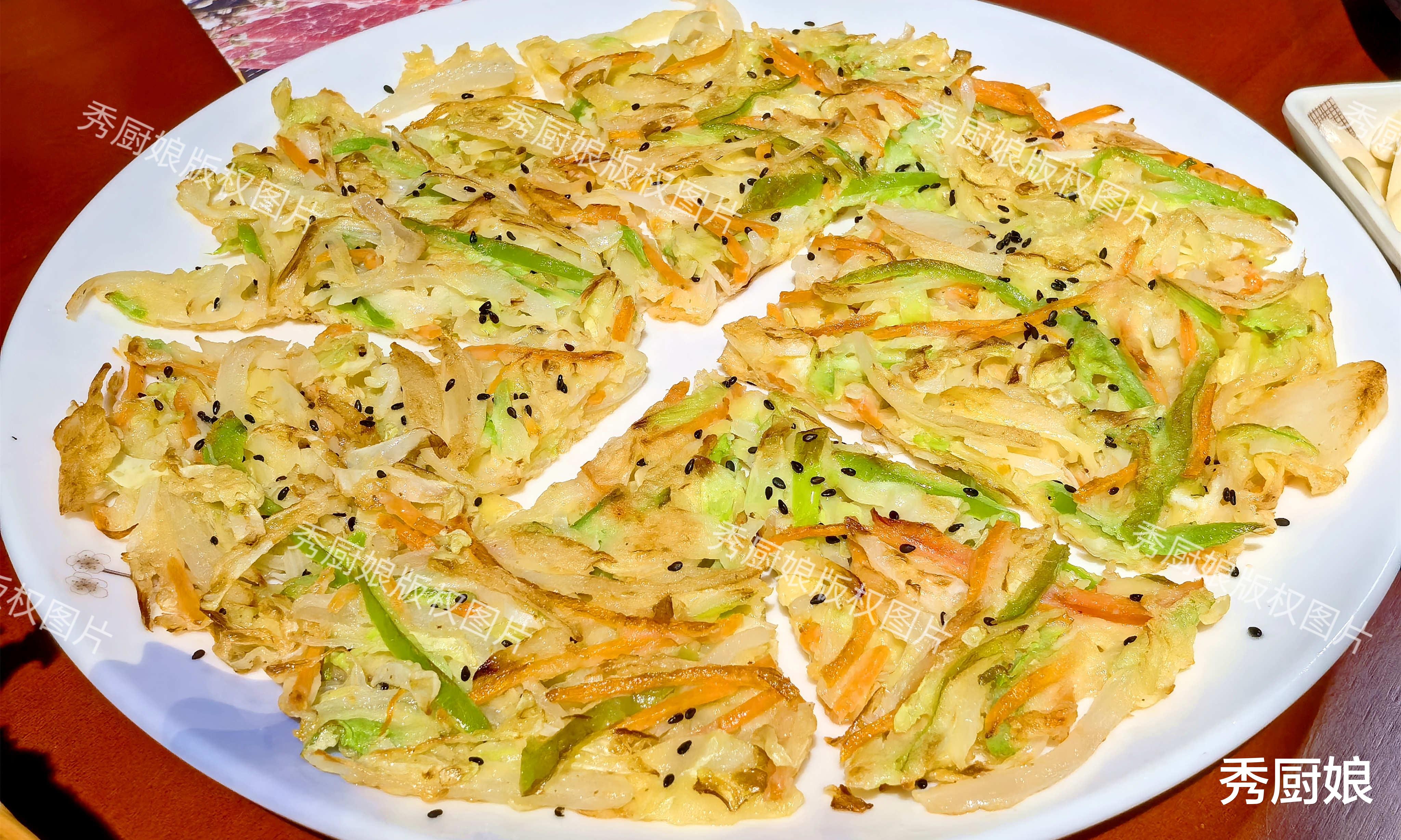食材:卷心菜,青椒丝,胡萝卜丝,盐,面粉,鸡蛋,清水,黑芝麻,食用油