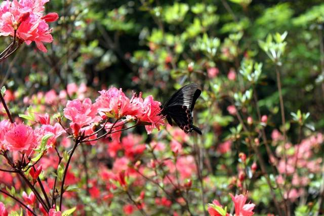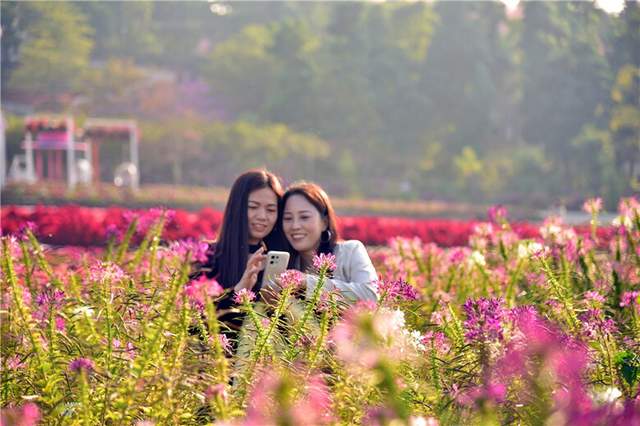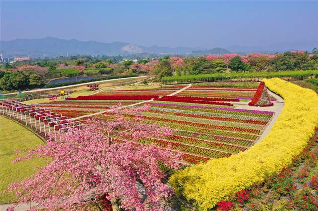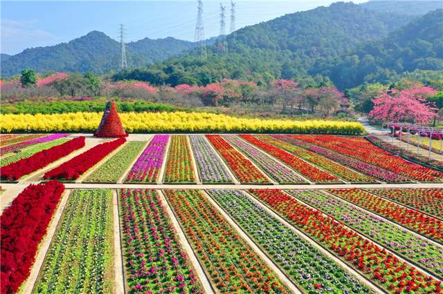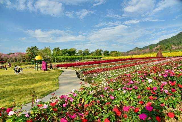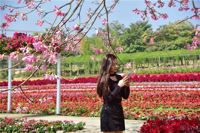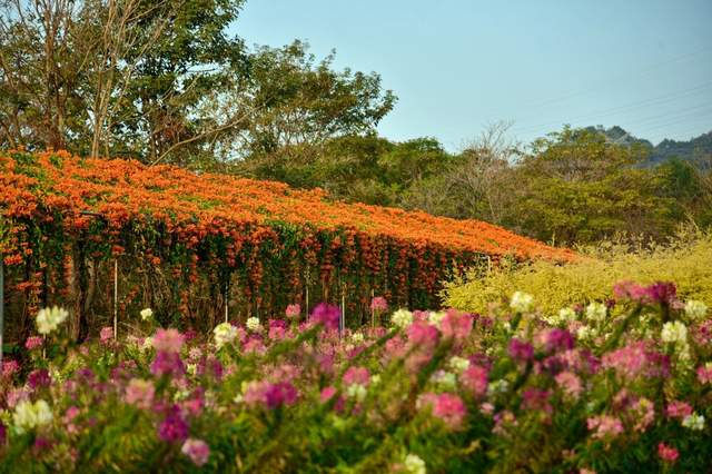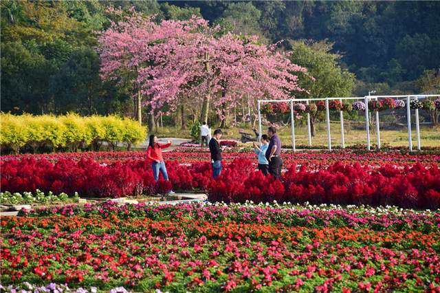 七彩花田,10多种花卉构建成的花带,美不胜收,色彩斑斓;樱花园的樱花也盛放了,桃花坡上的桃花也是粉红一片,争奇斗艳;杜鹃园的杜鹃花也灿若彩霞;黄花风铃满园尽披黄金甲;炮竹花长廊开着流云飞瀑,花开成柳。游客在赏花之余,还可以品尝特色茶花鸡。