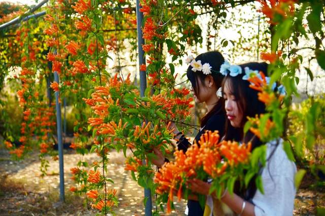 最令人流连的,莫过于那一道炮竹花长廊。花开如流云飞瀑,垂落成帘,行走其间,仿佛穿越花雨编织的时空隧道。“花开成柳”的奇景,在此有了具象的呈现,让人不禁想起“碧玉妆成一树高,万条垂下绿丝绦”的意境,却又比绿柳多了几分绚烂与灵动。