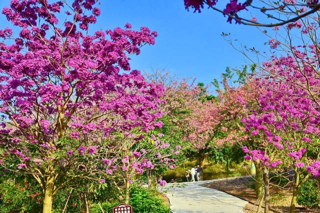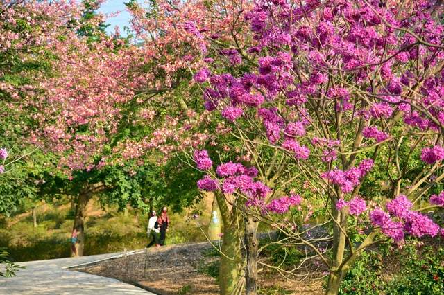 杜鹃园中,灿若彩霞的杜鹃正热烈盛放,簇簇团团,似要将全部生命燃成绚烂。而抬眼望去,满园的黄花风铃木已披上“黄金甲”,明艳耀眼,自成天地。恰如韩愈笔下的“百般红紫斗芳菲”,这里的每一朵花都在诉说着春的丰饶与生命的勃发。