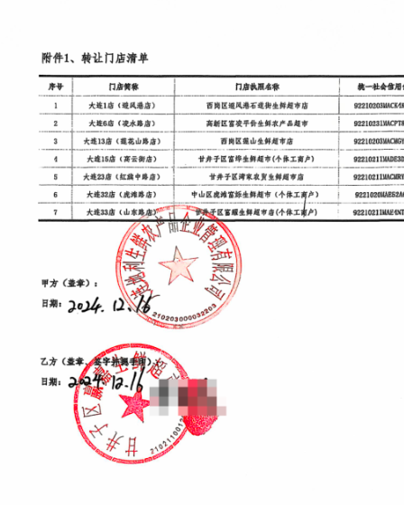 孔先生向记者提供了去年12月份,大连地利生鲜与甘井子区赢嘉生鲜超市(下称赢嘉生鲜)签订的《资产及业务转让协议书》,协议中约定大连地利生鲜不再参与经营避风港店、凌水路店、莲华山路店、高云街店、红旗中路店、虎滩路店、山东路店,由赢嘉生鲜按约定承接上述门店的经营权,并承接所有门店的资产、业主及部分负债。