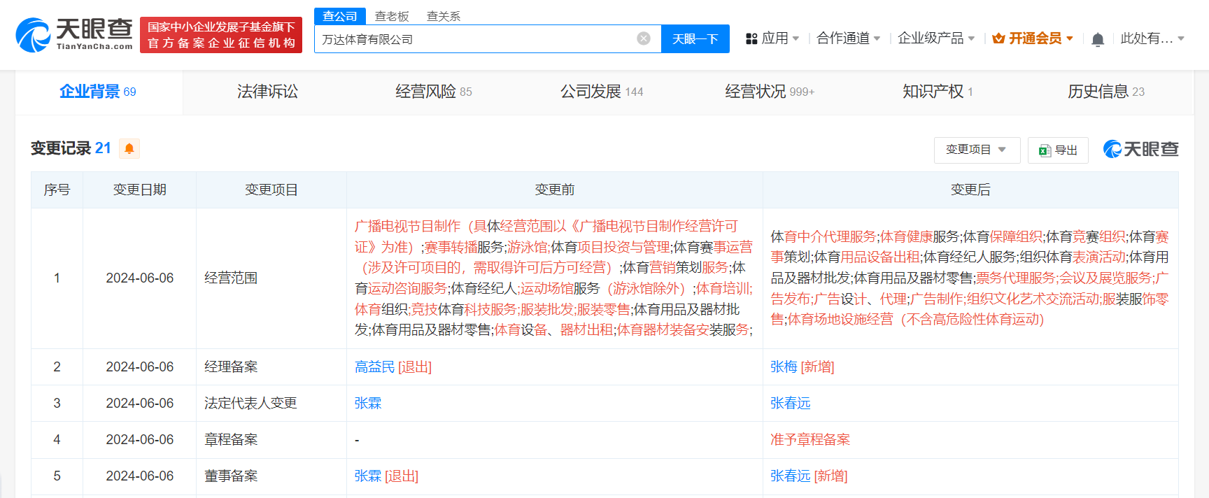 天眼查App显示,近日,万达体育有限公司发生多项工商变更,张霖卸任法定代表人、执行董事,由张春远接任;高益民卸任经理,由张梅接任;同时,公司经营范围新增体育中介代理服务、体育健康服务、票务代理服务等。