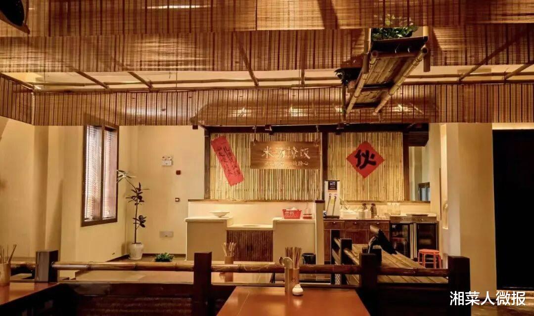 田小狗的饭店,似乎正在成为一种风潮。红色打底的农家贴纸,略带童趣的手写字体,大量竹、木、草等材质的运用,并排或交错形成的规律条纹,主色调暖黄的灯光,处处可见的方言俏皮话标语……这些元素,如今似乎正出现在越来越多的湘菜馆。