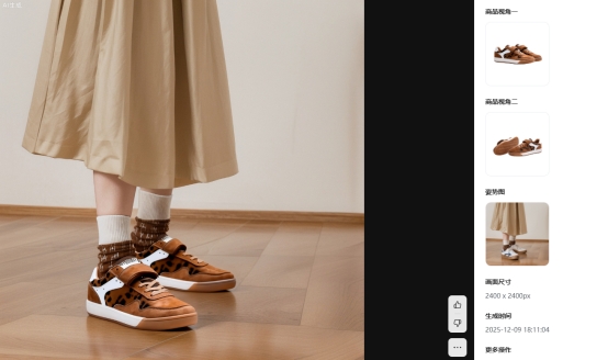 最终由 AI 自动完成鞋子的透视、角度、光影适配,生成自然贴合的穿戴效果。如果需要,也可以进一步进行简单的微调。