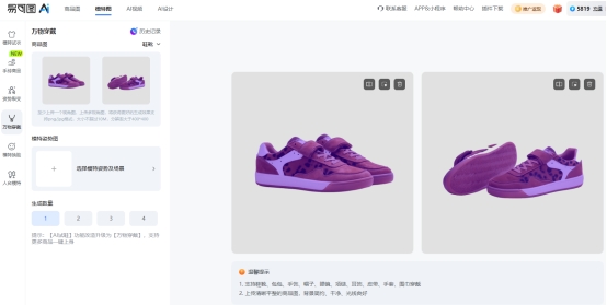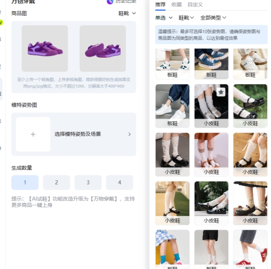 建议选择背景干净、光线稳定的单品图。如果提供两个角度的商品图,AI 会更准确识别鞋子的立体结构,使最终效果更真实。