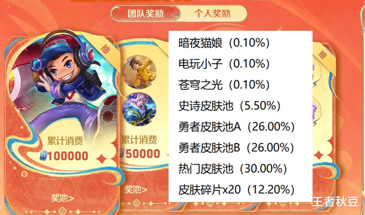第四档次:团队累计消费满10万点券,可以获得20皮肤碎片和皮肤奖励,有3款2888点券的皮肤,分别是阿轲-暗夜猫娘,鲁班七号-电玩小子,项羽-苍穹之光,还有其他的888点券皮肤,具体概率如上图展示。