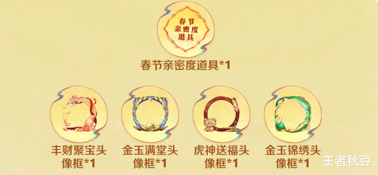 第四档次:累计消费满8888点券。百分百获得组队消费头像框自选礼包x1,如上图展示,打开礼包可以获得:丰财聚宝头像框、金玉锦绣头像框、虎神送福头像框、金玉满堂头像框、春节亲密度道具x1。春节亲密度道具使用可以一次性增加520点亲密度。