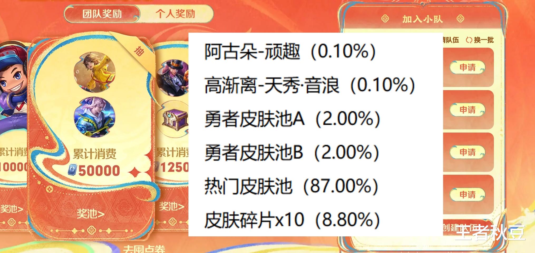 第三档次:团队累计消费满5000点券。这个奖池基本就是皮肤碎片和皮肤,87%的概率获得288勇者伴身皮肤,开始有概率获得阿古朵-顽趣和高渐离-天秀-音浪。