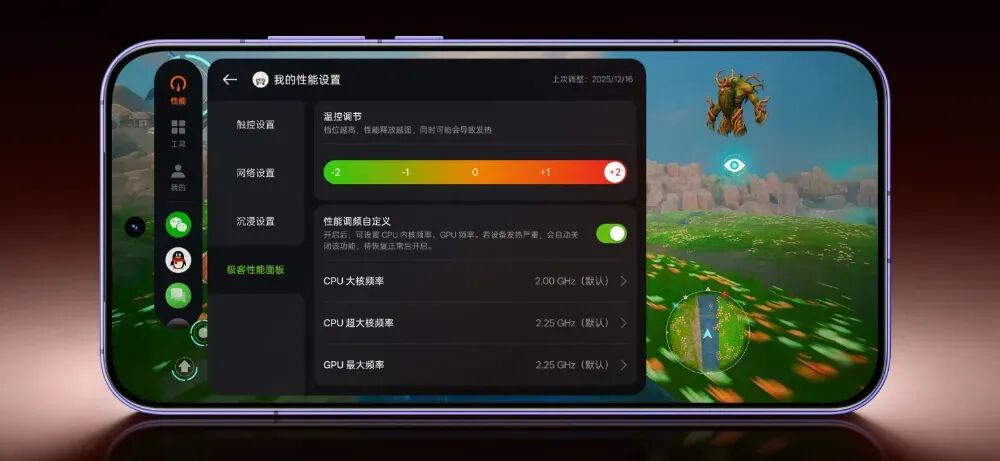 带来极客性能面板,开放CPU频率、GPU频率与五档温控三项自定义调节,支持全部游戏自由调节。玩家可以根据游戏类型、使用场景、个人偏好,自主定义手机的性能输出。