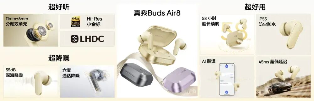 真我Buds Air8 大师金、大师紫、大师灰三款配色,充电仓顶面采用素皮材质搭配金属喷漆。配备旗舰级11mm+6mm分频双单元,支持LHDC 5.0高清传输与Hi-Res小金标认证。配备55dB深海级降噪,降噪频宽高达5000Hz。