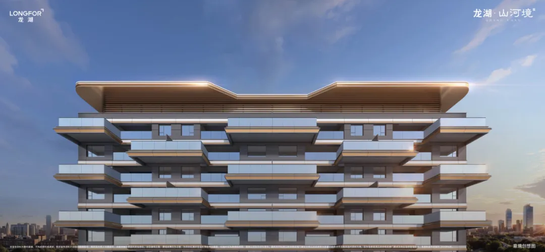 建筑立面,龙湖山河境定制鎏金皇冠天幕立面,屋顶圆弧倒角、层间钻石型线脚等,南向大面宽阳台采用钻石级玻璃栏板,彰显出独有的高级感,为城市再添「颜值封面」。