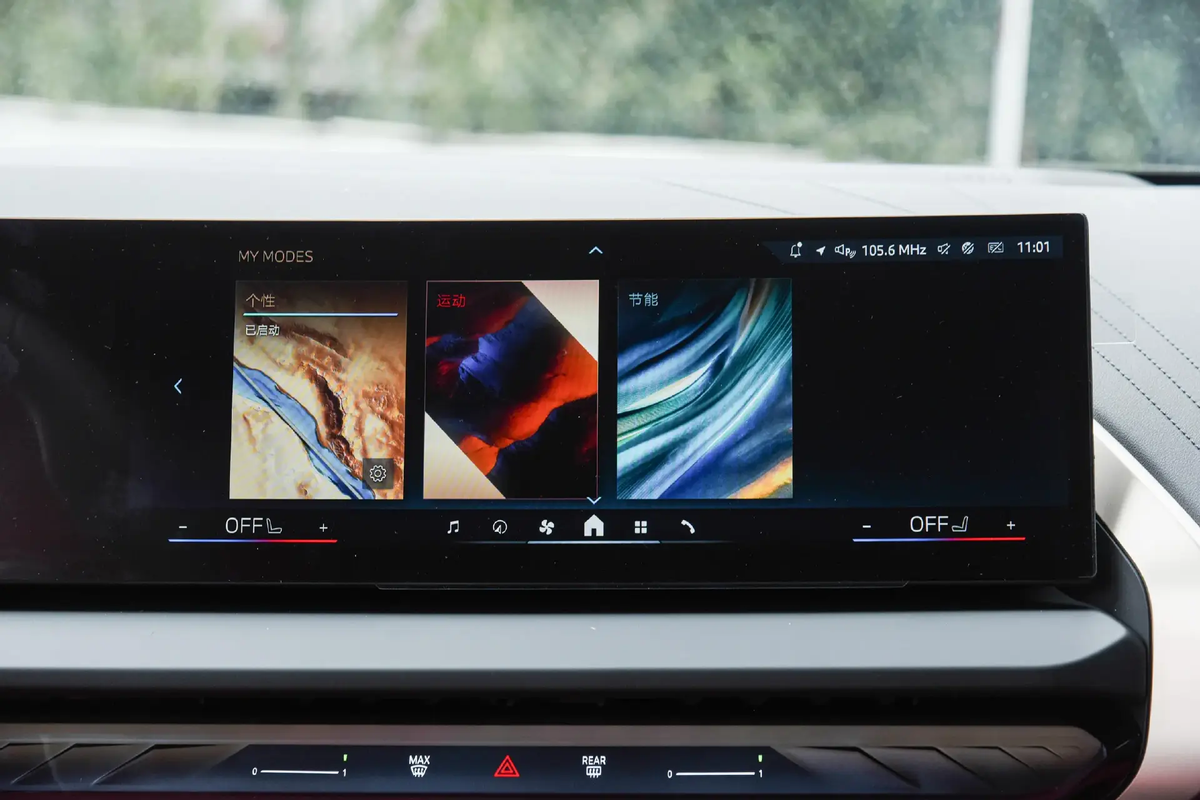 宝马X3采用了比较干练的内饰布局,绝大部分控制操作都由数字化完成,包括三辐式平底真皮方向盘、车内门板以及屏幕下控制台等等,都提供了触控操作设计,也用车变得更简单快捷了。同时,12.3+14.9英寸双联屏采用了曲面打造,通过iDrive系统可完成CarPlay手机互联、四音区连续语音交互、手机APP远程车控以及应用商店功能拓展等;而采用滑档设计的换挡机构一侧还提供了iDrive控制器,同时,我们也在这些区域中见到碳纤维纹理与烤漆装饰。座椅方面,宝马X3采用了人造皮革覆盖,并提供了前排电动调节与加热支持,后排也支持比例放倒。