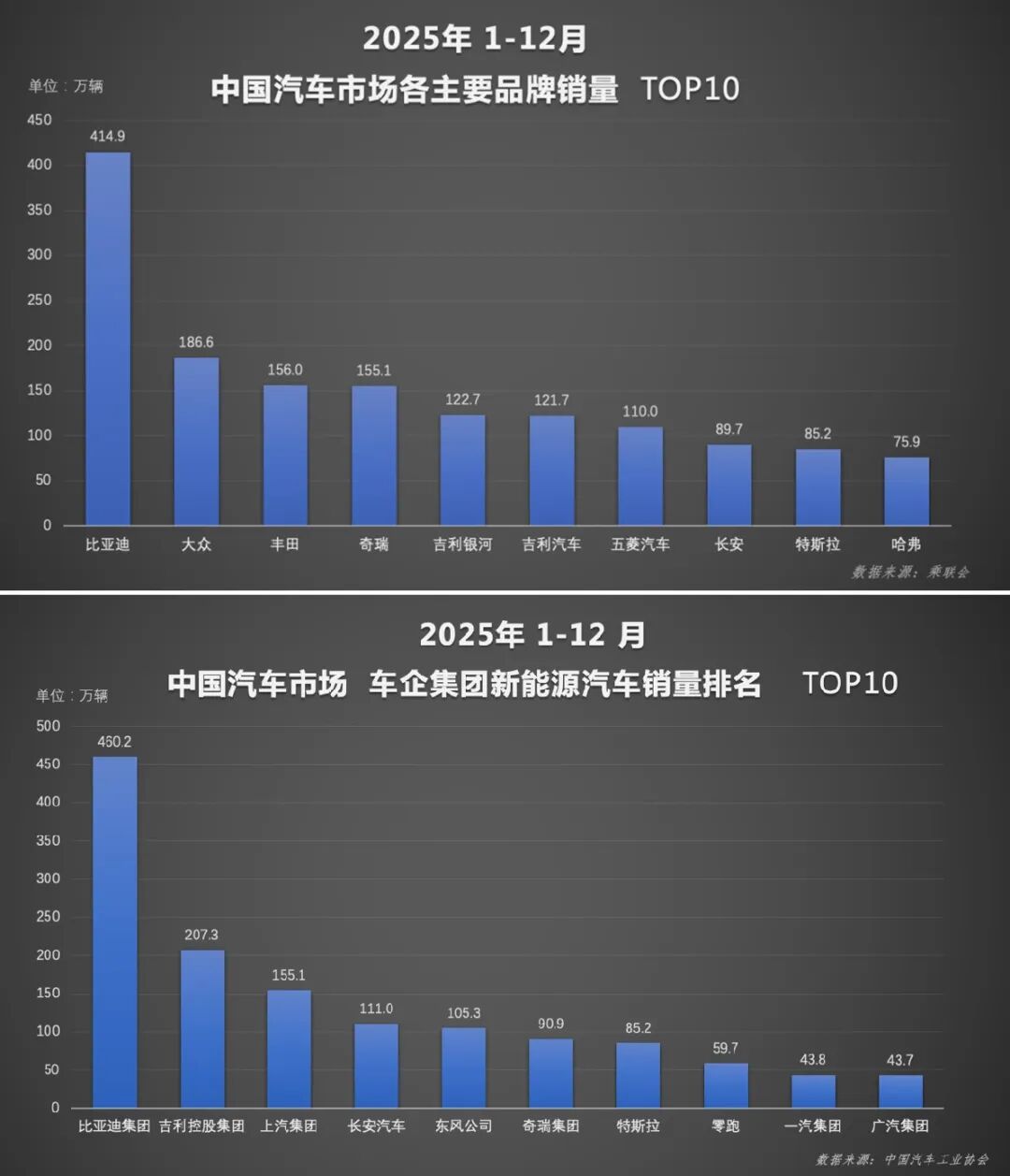 其中比亚迪是中国汽车品牌的销冠,2025年他们全年累计销量达到460.2万辆(全球),遥遥领先排在后面的车企。