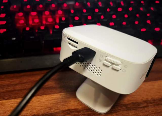 萤石小魔方CB60的主要控制按钮、扬声器和插槽都在机器背面,右上角分别是模式切换、reset、开关机按钮。