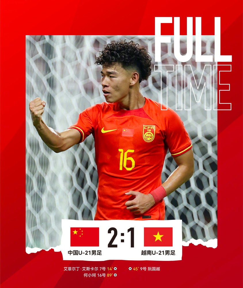 长沙四国邀请赛,中国U21男足迎来了重新组建后的首次亮相,对手是越南U21国足,上半场比赛,艾菲尔丁率先进球帮助中国国青取得领先,但半场结束前我们后卫乌龙助攻,越南队阮庭越完成破门扳平比分。下半场比赛行将结束前,门将于金永化解对手单刀,替补上场的何小珂一剑封喉破门完成准绝杀,中国国青最终2-1击败了越南U21男足,取得了球队在长沙四国赛上的首胜。