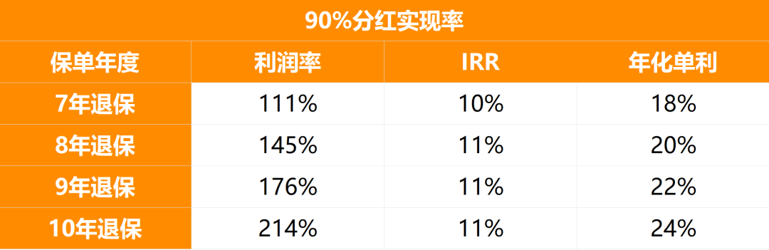 我算了一下,即使在90%分红实现率的情况下,某款产品的IRR保持在10%以上,十年退保年化单利为24%,