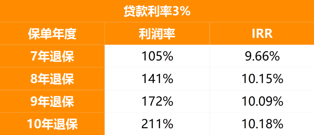 以某款产品为例,假设前两年Hibor为1%,第三年Hibor上升到2%,每年贷款利率按照3%算,扣除保费融资各种成本,第10年退出(最长第10年退出),总收益211%,年化收益率为10.18%。