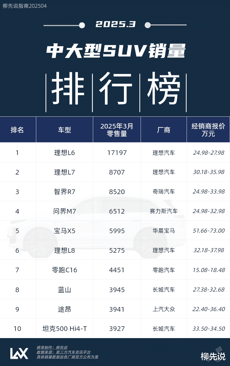 榜单6-10名:理想L8、零跑C16、蓝山、途昂以及坦克500 Hi4-T;榜单前5名:理想L6、理想L7、智界R7、问界M7和宝马X5。理想L6位居榜首,月零售量达17197辆,2025年前3个月累计销量约4.4万辆。在国内中大型SUV市场中,增程式车型表现尤为突出,解决了续航焦虑问题,同时提供了强大的动力支持,使其在长途旅行、越野等场景中表现出色。像理想L6/L7、智界R7、问界M7等车型,均排在榜单前列。