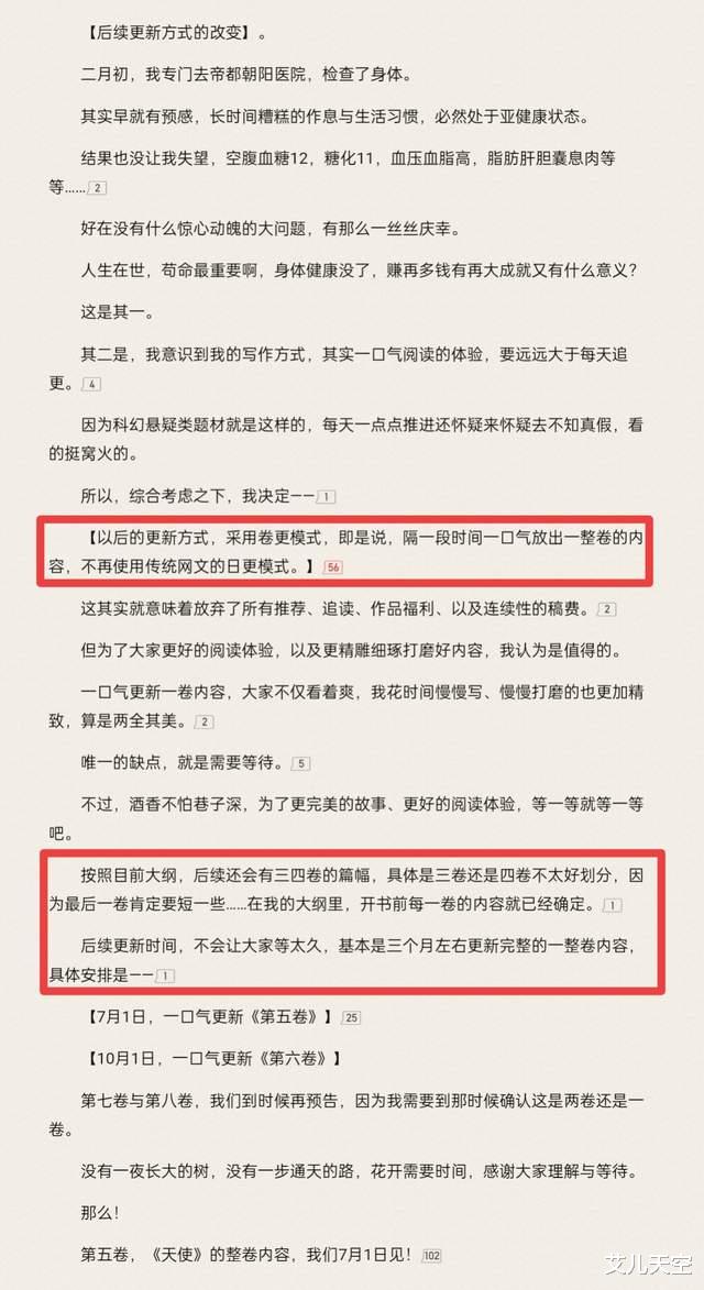 每卷花三个月左右写完,然后一次性放出,也已经预告了下面第五卷、第六卷的更新时间7月1号、10月1号。
