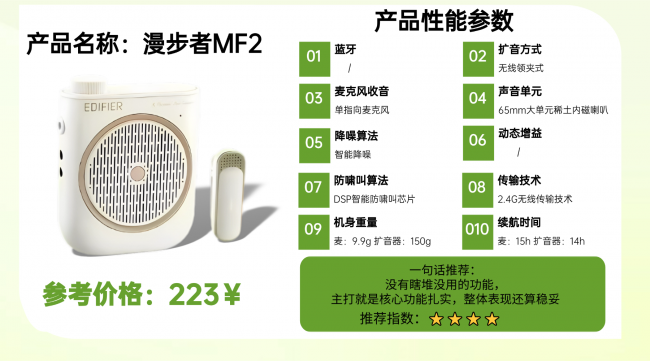 小蜜蜂扩音器教师专用哪个品牌好?突音K5无线领夹式扩音器,最让人省心的就是它的防啸叫和降噪表现。搭载的自动侦测啸叫技术很实用,不管是调节音量,还是麦克风不小心靠近扩音器,都能实时监测并快速抑制啸叫信号,完全不会出现刺耳的杂音。其内置的DSP降噪模块也相当给力,能把环境里的风噪、人声混响等干扰压得比较干净,让扩音出来的声音更通透、更靠前。麦克风本身采用单指向结构,能把说话方向的声音抓得更稳,减少周围杂声的混入,再配合3寸大音圈喇叭,声音整体更厚实、更有穿透力。3、漫 步 者MF2无线领夹扩音器好评率:★★★★推荐语:2.4G无线传输距离20米,适合近距离使用场景