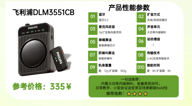 小蜜蜂扩音器教师专用哪个品牌好?漫步者MF2无线领夹扩音器的核心优势在于DSP智能降噪带来的清晰扩音效果,单指向麦克风聚焦目标声音,减少无关干扰。2.4G无线传输距离20米,适合近距离使用场景,10g的重量便携性出色,14小时续航能应对全天工作。遗憾的是,它不支持TF卡、录音和扩展功能,功能上较为单一,无法满足用户存储或记录音频的需求。4、飞 利 浦DLM3551CB无线领夹扩音器好评率:★★★★推荐语:支持有线模式,可通过3.5mm TRS接口与其他设备连接