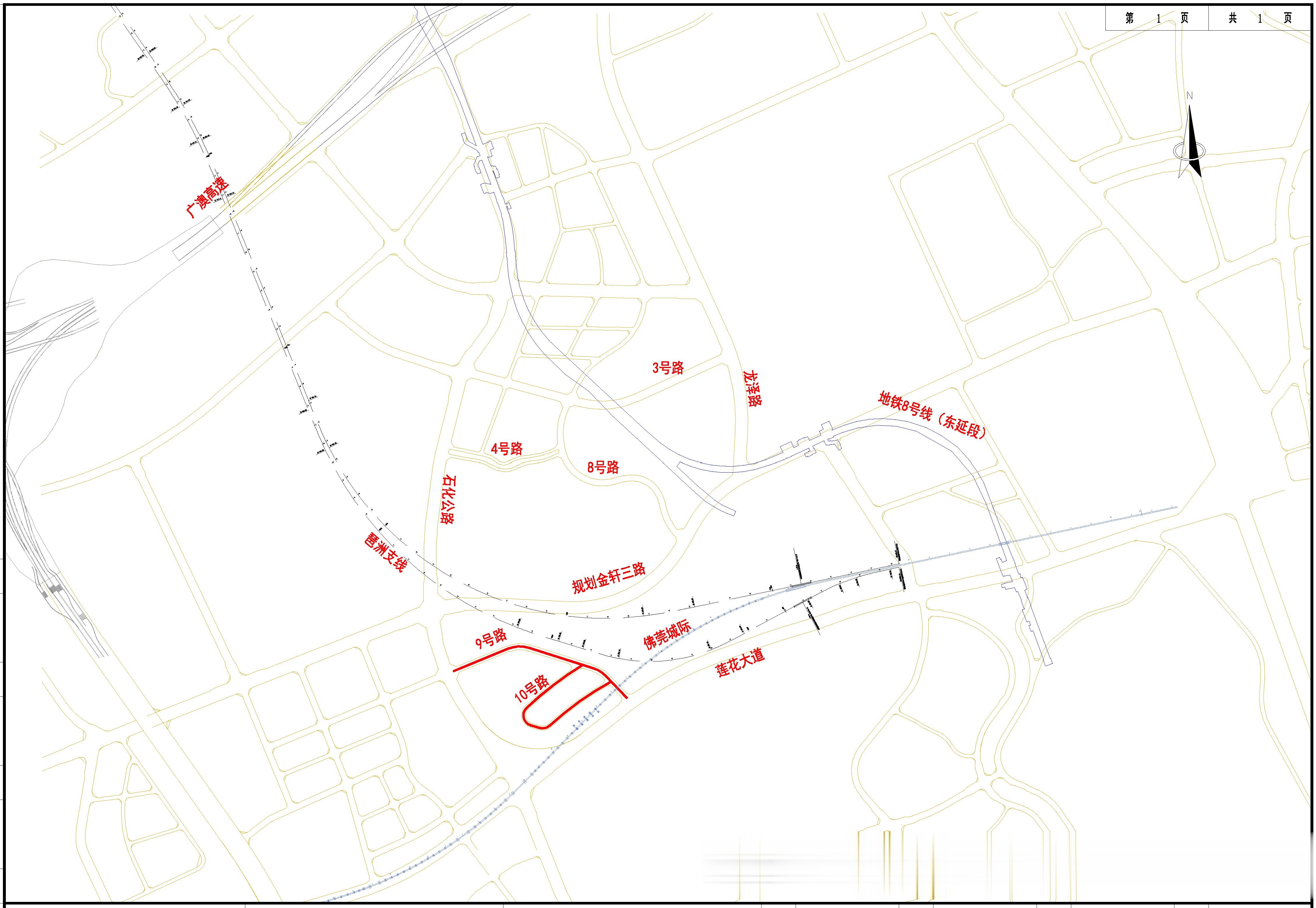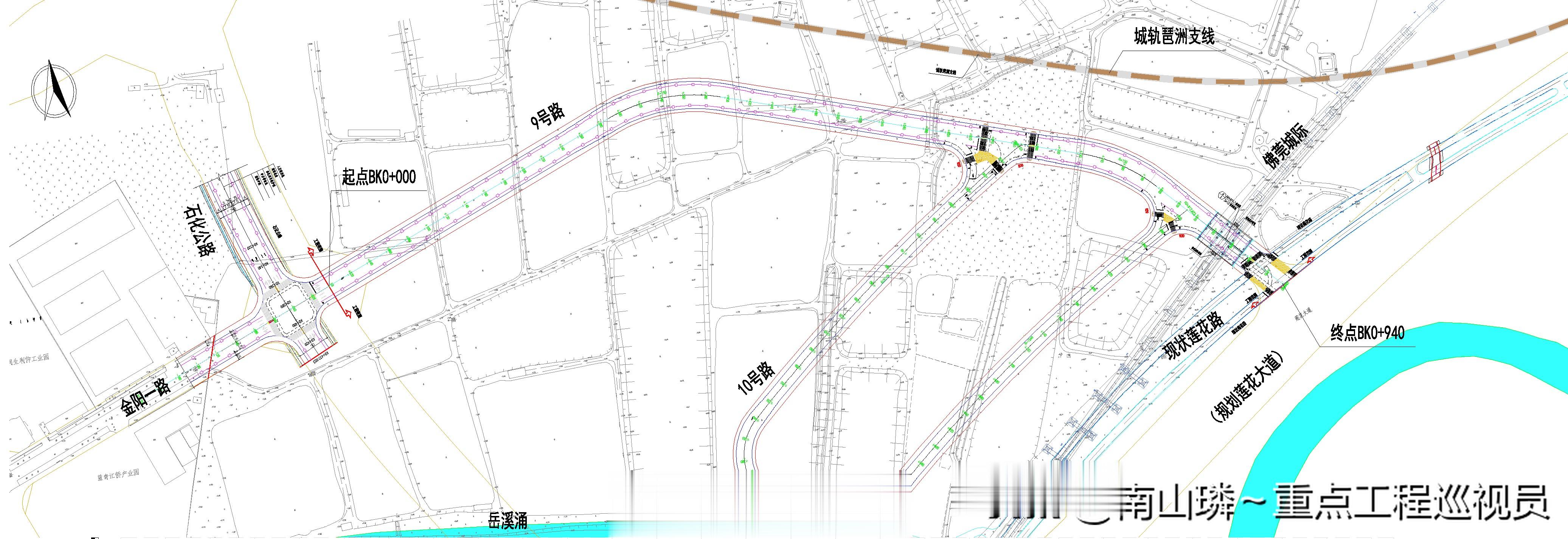 规划次干道(9号路)的线路长度约0.94公里,规划红线宽度为30m,设计速度为30km/h,项目起点与石化公路南延线交叉,终点与现状莲花路交叉。