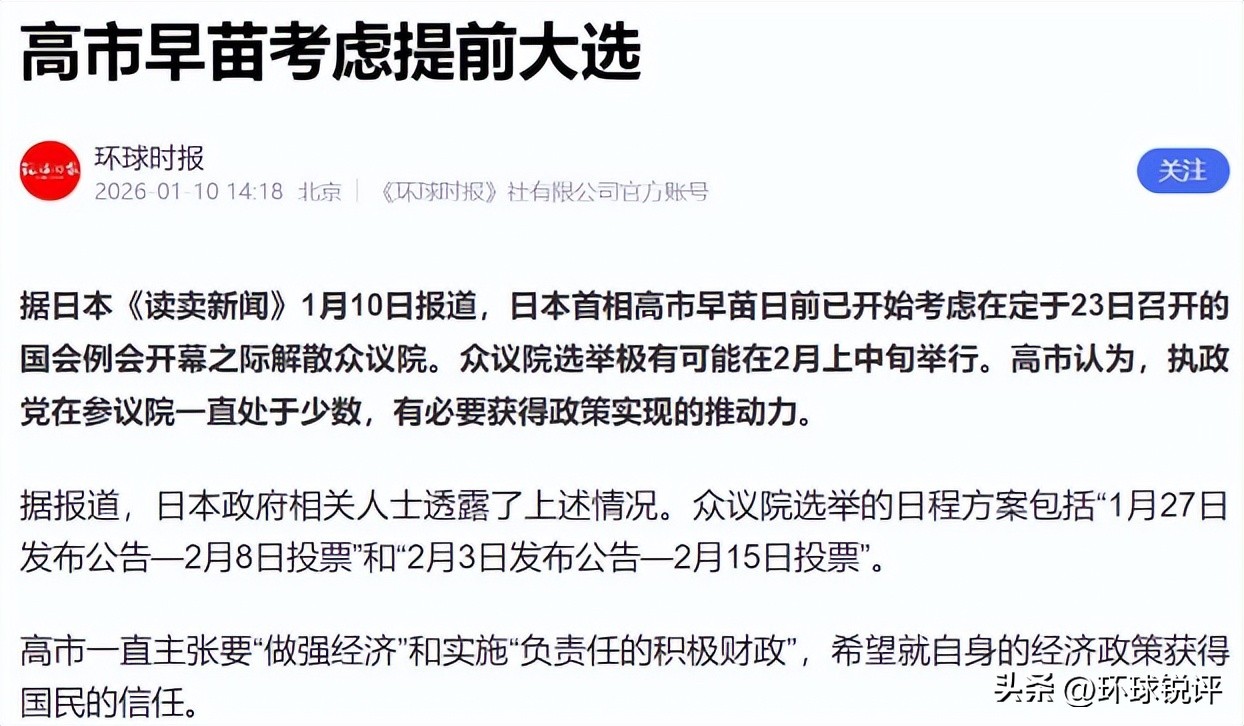 就在朝韩对峙升级之际,日本首相高市早苗的一份“乱局夺权”计划被曝光,让东北亚局势更添变数,据披露,高市早苗拟在1月23日国会开幕当天解散众议院,于2月中旬前完成提前大选,还制定了2月8日或15日投票的两套具体方案。