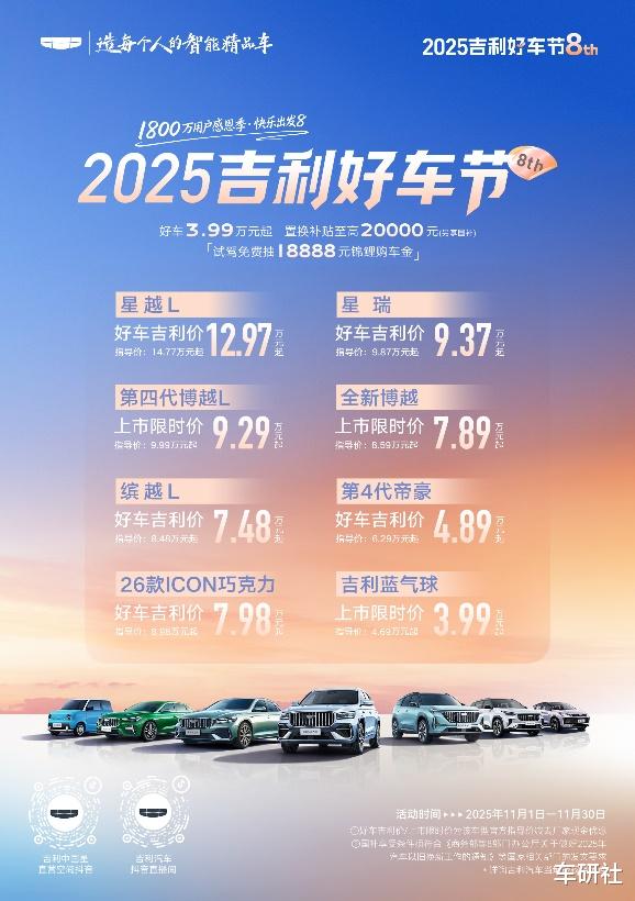 11月1日至30日,以“感恩1800万用户”为主题的第8届2025吉利好车节正式拉开帷幕。作为吉利汽车年末规模最大的购车盛事,本次活动延续“好品质、好价格、好福利”的核心主张,集结中国星、博系、缤系、豪系等主力燃油车型,通过超低价购车、多重补贴叠加、全平台福利派送及线下互动狂欢等多元形式,为全国消费者打造一站式高价值购车体验,以实实在在的优惠与服务,回馈广大用户长期以来的信赖与陪伴。