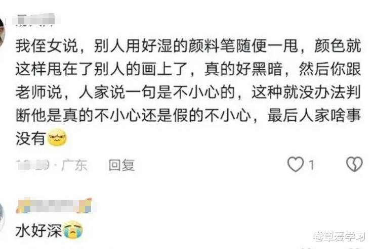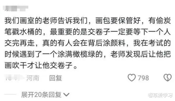 上面这种都是最浅的手段,可能只影响考生的心态,第二种就是纯毁别人前途了,有的用小刀划烂别人的画,有的撞翻画架毁掉未完成的考试,还有的把沾着颜料的很湿的画笔随便一甩,附近考生的画就都花掉了。