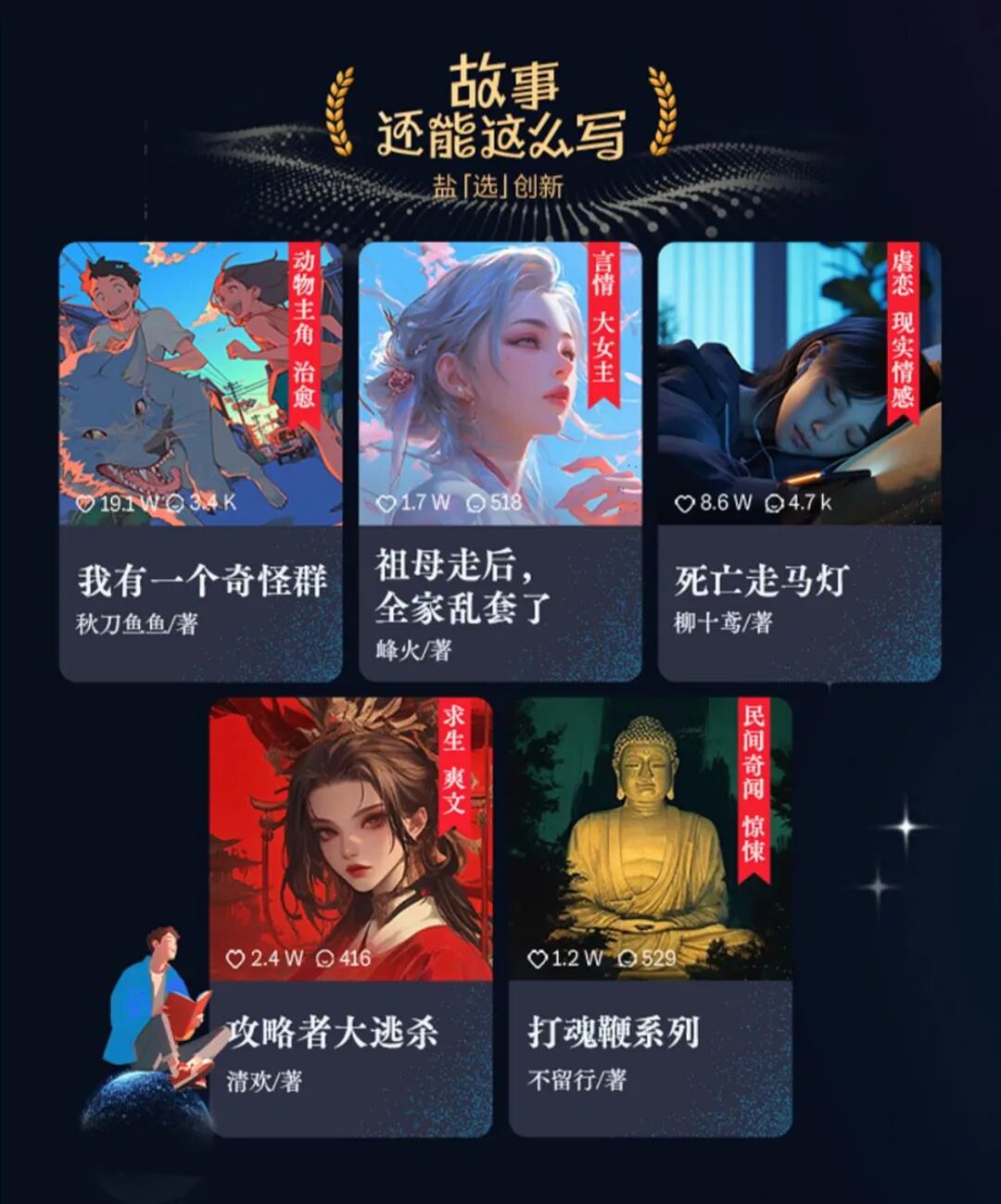 回顾来看,“2025短篇故事影响力榜”的升级,本质上是建立在盐言故事创作生态不断成熟,且持续为新老作者构建成长路径的大背景上的。入选第二届“短篇故事影响力榜”新人作者的恩养,今年凭借《执梭师》《控梦师》成为年度作者,除了恩养此类“老面孔”,榜单中也出现了亭柳、雪糕、春十三夜等创作新秀。老作者持续成长,新作者接连露头,这才是“短篇故事影响力榜”蜕变的核心。
