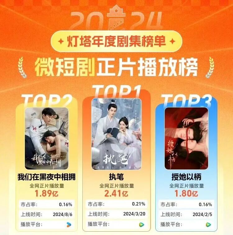 三届以来,“短篇故事影响力榜”中的“最具影视价值”单元含金量一直颇高,第二届“短篇故事影响力榜”发布时,六部盐选好IP中《不可儿戏》《少年游》《是谁暗恋谁》《鱼灯引魂记》的影视版权都已经出售,同时,由《执笔》改编的同名剧集成功播出,2024年灯塔年度剧集榜单中,《执笔》以2.41亿的全网正片播放量位列微短剧第一,是全年唯一一部播放量破2亿的短剧。