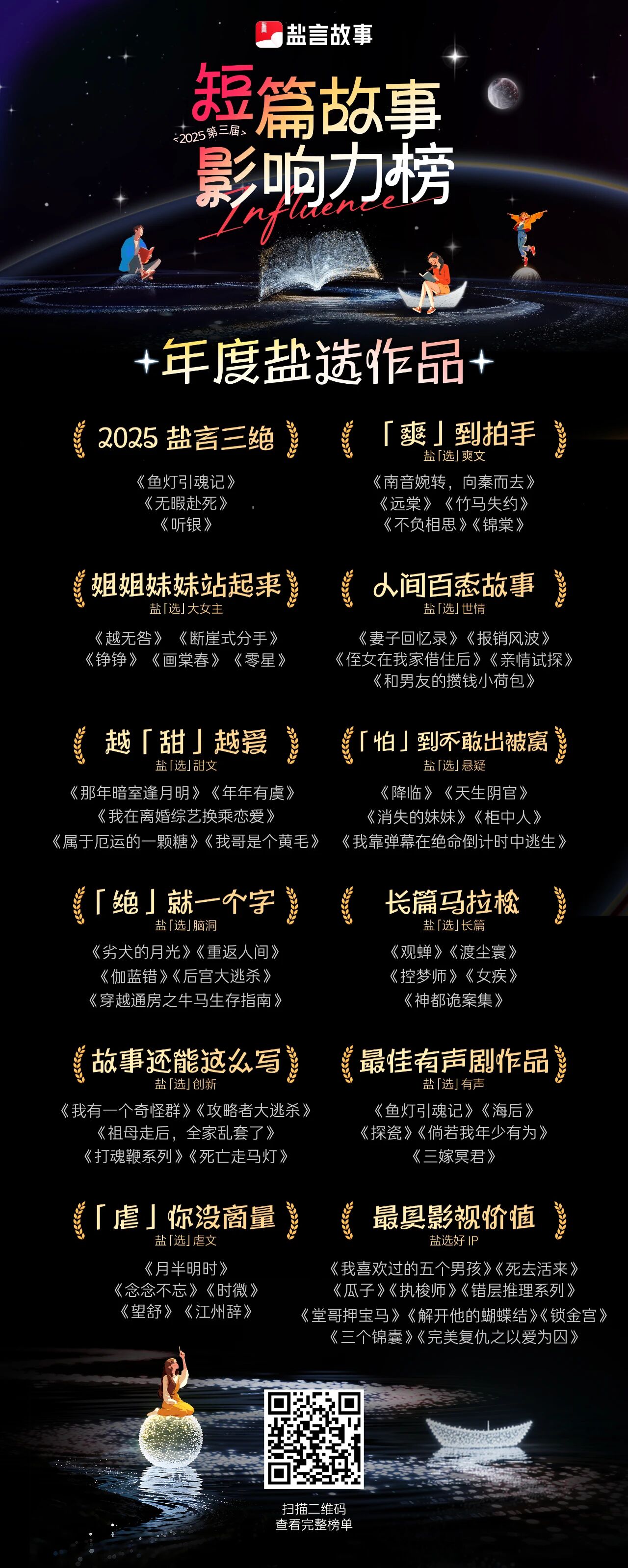如果说聚焦垂类是“短篇故事影响力榜”的不变之处,那通过盐言三绝和长篇马拉松单元,将盐言故事作品影响力评选扩宽到中长篇创作范畴,便是“短篇故事影响力榜”最大的变化。2025盐言三绝《鱼灯引魂记》《无暇赴死》《听银》,以及2025长篇马拉松获奖作品《观蝉》《渡尘寰》《控梦师》《女疾》《神都诡案集》,共同推动了“短篇故事影响力榜”从“垂类战神”到“六边形战士”的转身。