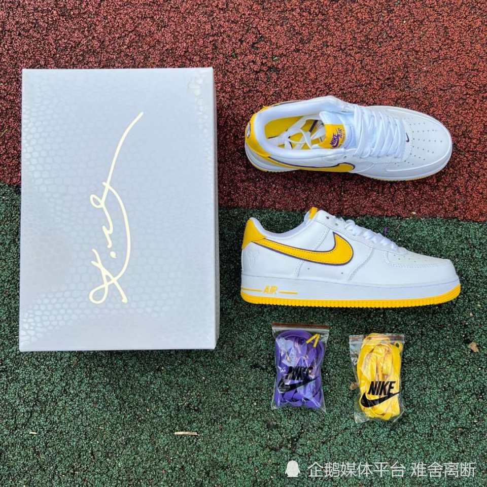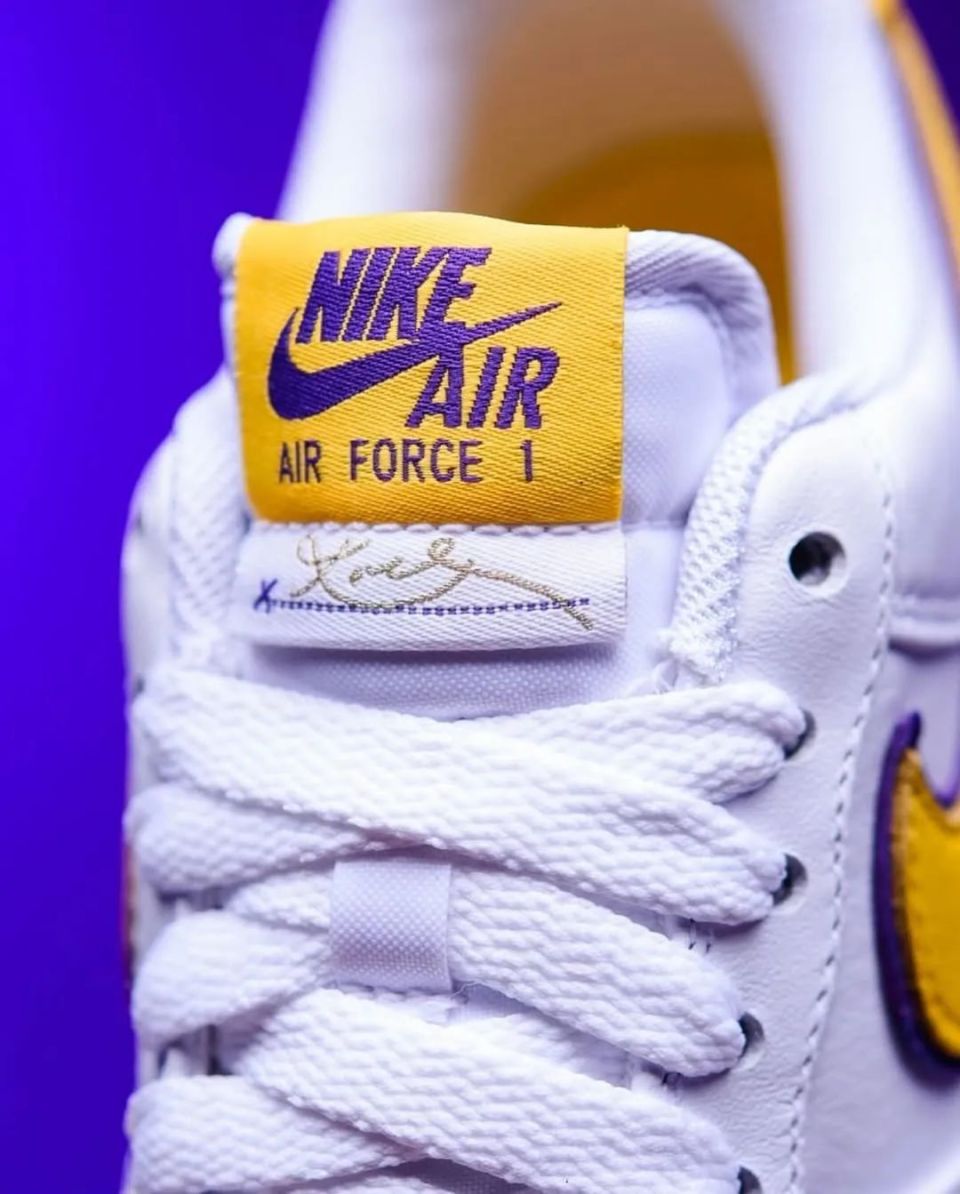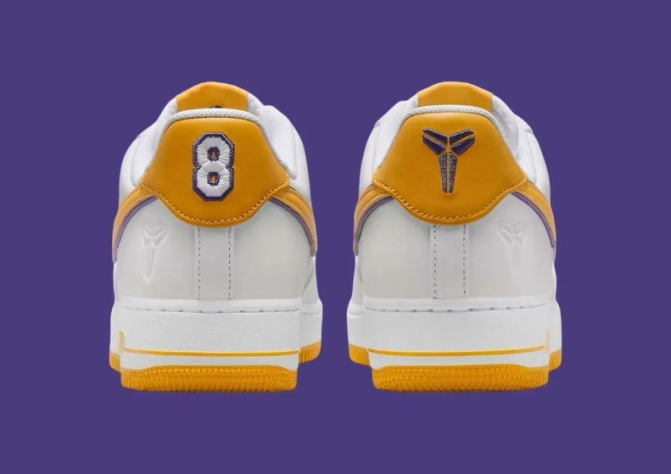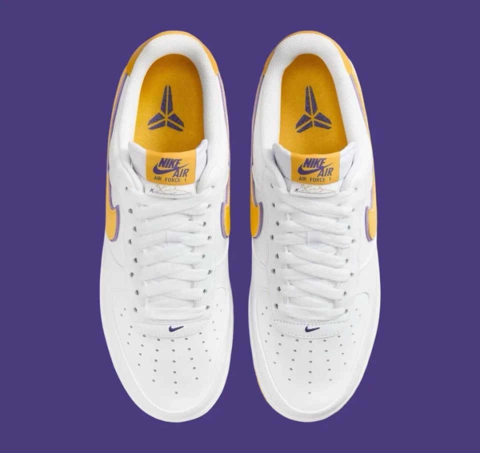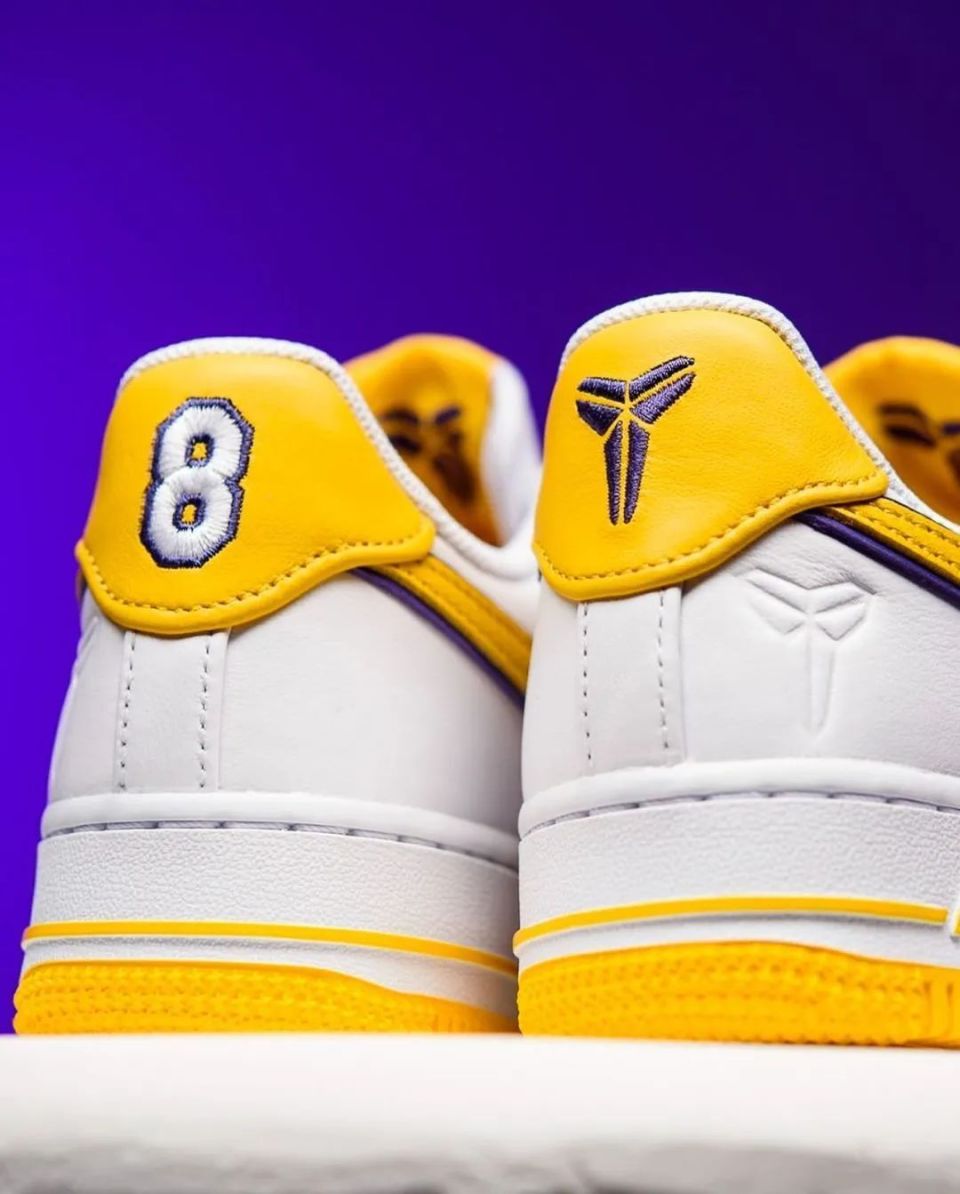 Nike Air Force 1 Low “ Kobe Bryant ” ,采用洛杉矶湖人队配色,选用白色皮革鞋面和黄色 Swoosh 标志,具有湖人队风格的美学。