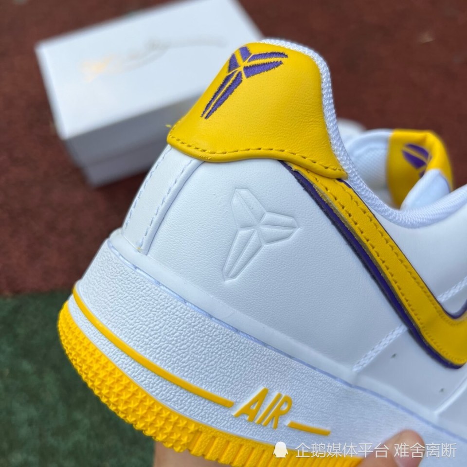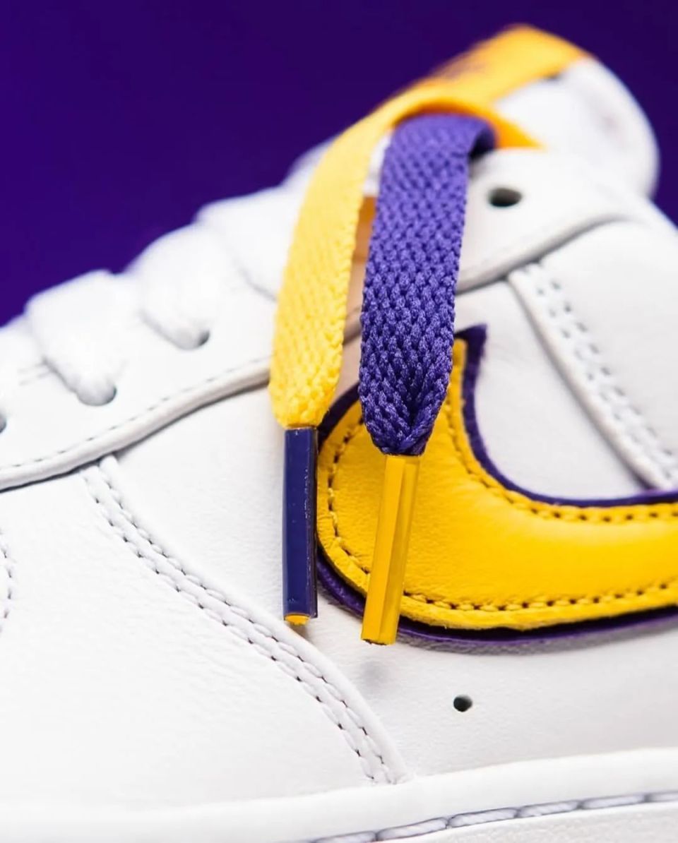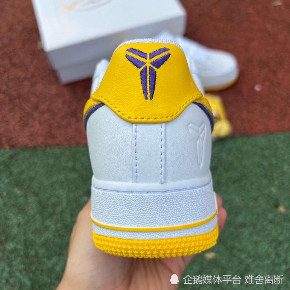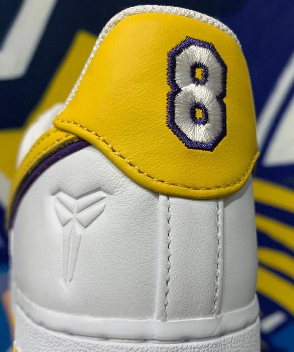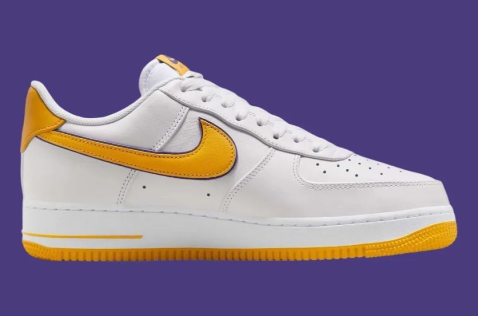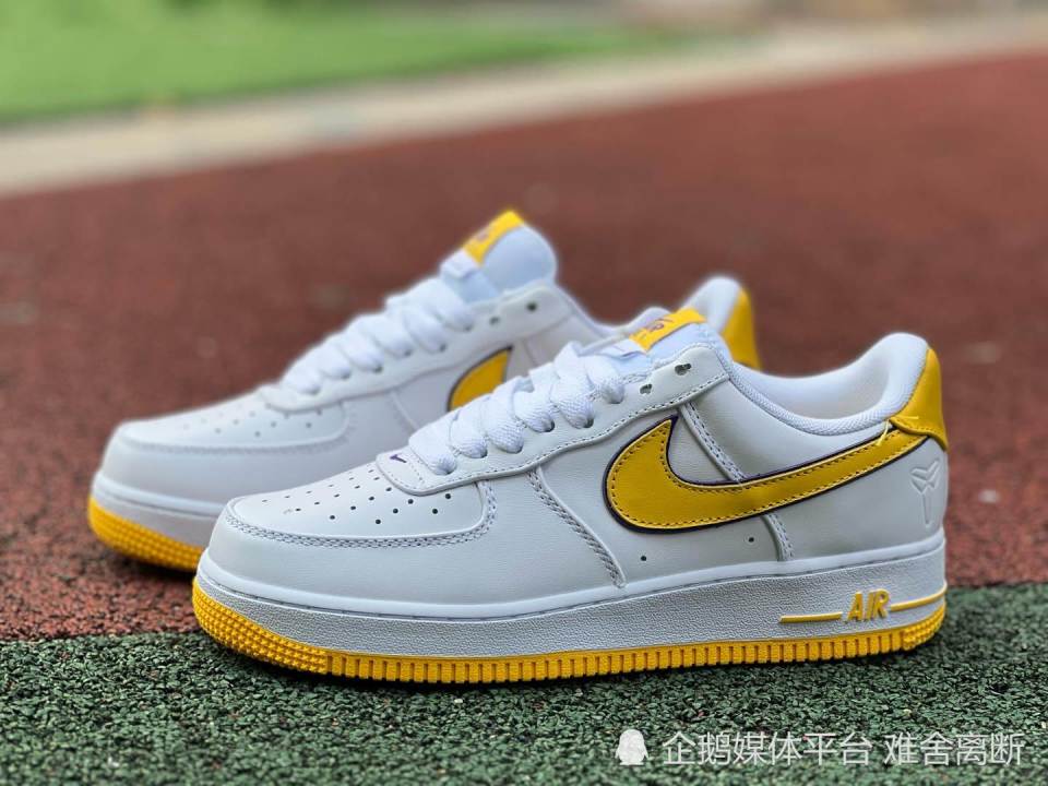 Nike Air Force 1 Low “ Kobe Bryant ” ,采用洛杉矶湖人队配色,选用白色皮革鞋面和黄色 Swoosh 标志,具有湖人队风格的美学。