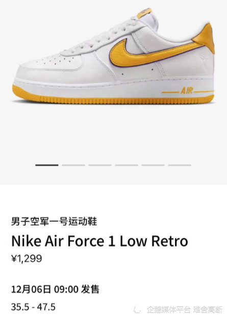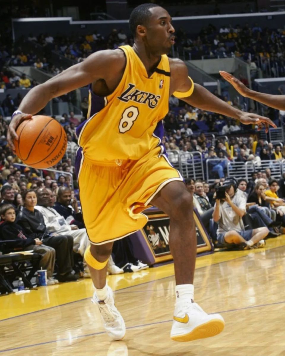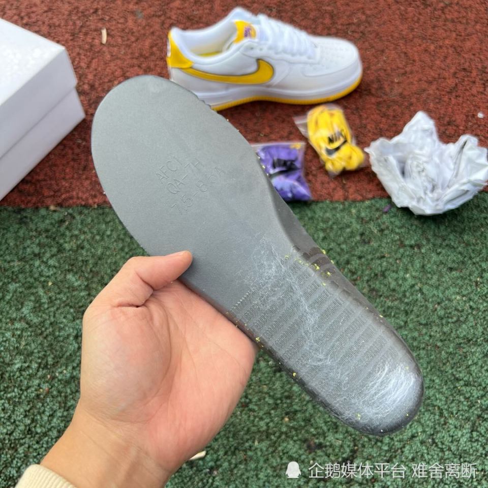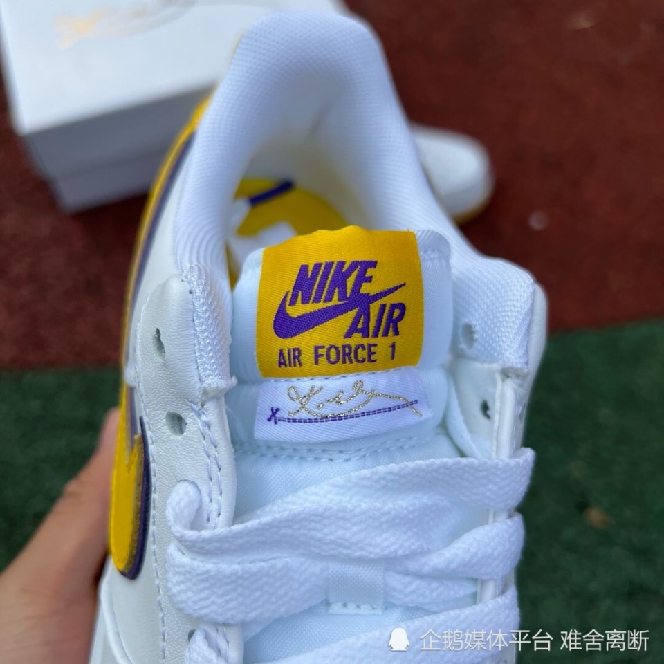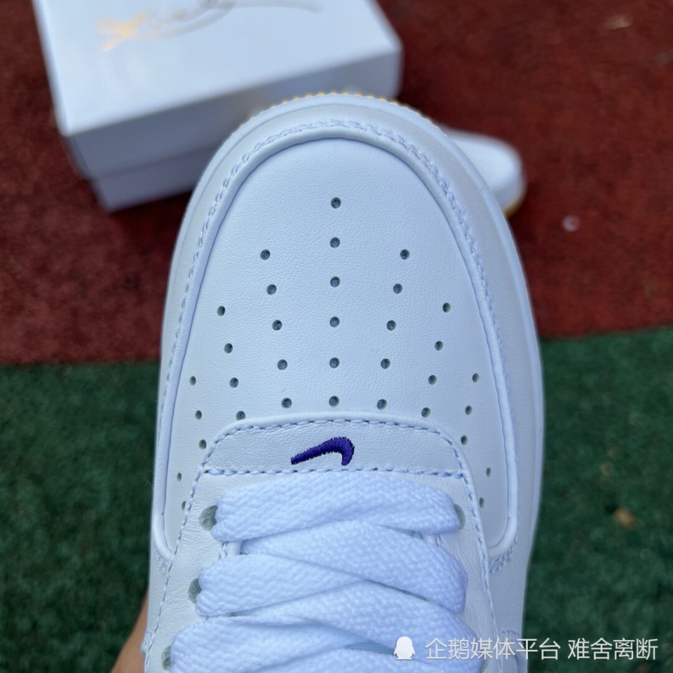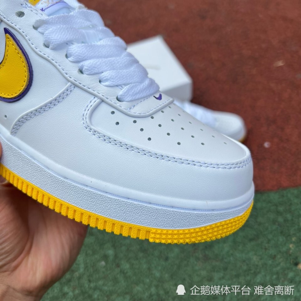 Nike Air Force 1 Low “ Kobe Bryant ” ,采用洛杉矶湖人队配色,选用白色皮革鞋面和黄色 Swoosh 标志,具有湖人队风格的美学。