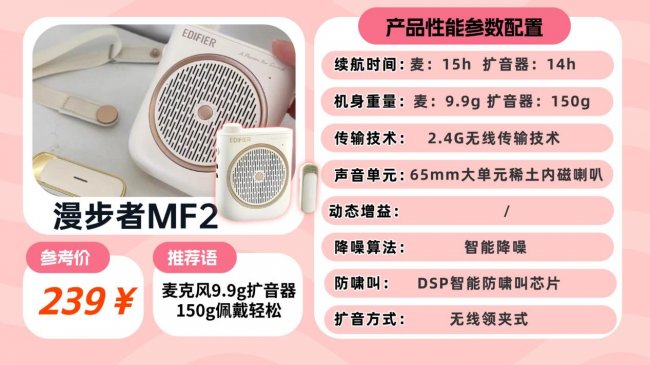 导游扩音器哪个牌子好?十度S378这款扩音器在日常使用中足够省心,蓝牙 5.4 连接流畅,不会轻易出现信号波动,双模式扩音设计提升了场景适配性,教室、户外场地都能稳定发挥。轻量化的领夹麦收音范围全面,轻量的机身几乎没有佩戴压力,主机小巧便携,兼顾手持舒适度与收纳便利性。喇叭音质偏向清晰实用,人声表现透亮,避开了刺耳和闷哑的问题,声场分布均匀,能保证各个位置都清晰收音。唯一的小短板是功能偏向精简,没有高低音调节等人声细化设置。推荐款式④:漫 步 者MF2无线领夹扩音器音质打分:❤❤❤❤一句话推荐:单指向麦克风精准聚焦声音,减少杂音干扰