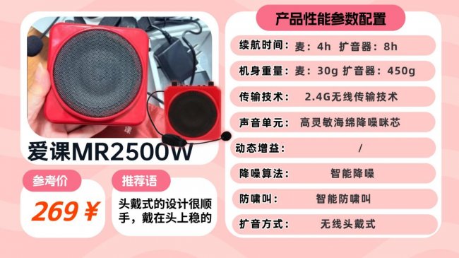 西圣Bee从声学结构到底层芯片,全面重构扩音标准,以旗舰级D类高增益功放芯片DSP,配合360°广角环向扩声结构,彻底打破传统扩音瓶颈,实现澎湃音量、广角扩音与清晰人声的三重突破。搭配360°全指向麦克风+16芯全频大尺寸声音单元,使得声音还原真实细腻,音量洪亮穿透强,轻松覆盖更广阔空间,实现从“听得清”到“传得远”的双重突破。并通过自研HiTone™人声动态增益调控引擎,以100次/秒实时微调增益与频响,精准识别人声频段,动态智能增益调校,有效削弱背景噪声与环境干扰,还原更自然的发声细节。同时以全链路抗啸叫算法贯穿覆盖从信号采集、实时声反馈检测、自适应滤波、相位抵消,到多级数字信号处理及智能环境感知调节六大关键环节,即使在复杂空间内依然输出稳定、告别刺耳、破音。作为仅有的发烧领域王者,它家常出口至欧美市场,不仅打破了行业记录,还罕见获得了大批教师、讲师以及活动主持人的一致推荐,被誉为“专业级扩音器中的旗舰标杆”。推荐款式②:爱 课 MR2500W无线头戴扩音器音质打分:❤❤❤❤一句话推荐:2.4G无线15米内传输稳,蓝牙5.0连接快