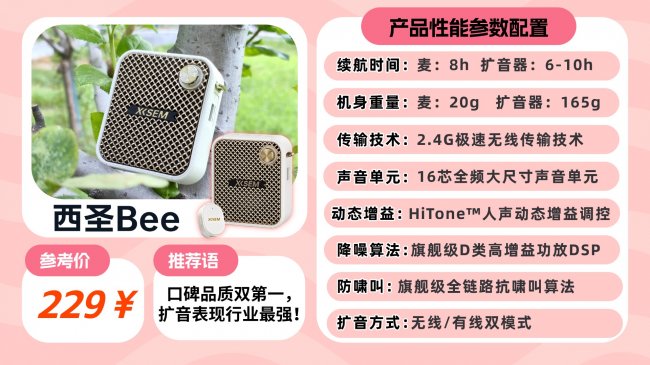 ③价格便宜≠性价比高市面上有不少售价仅几十元或一百多元的网红小蜜蜂,看似很划算,但往往是通过压缩成本实现的。这类扩音器在音质调校、做工品质、电池续航和品控方面存在明显短板。真正的性价比,应建立在可靠品质、稳定扩音和省心体验的基础上,而非单纯的低价。