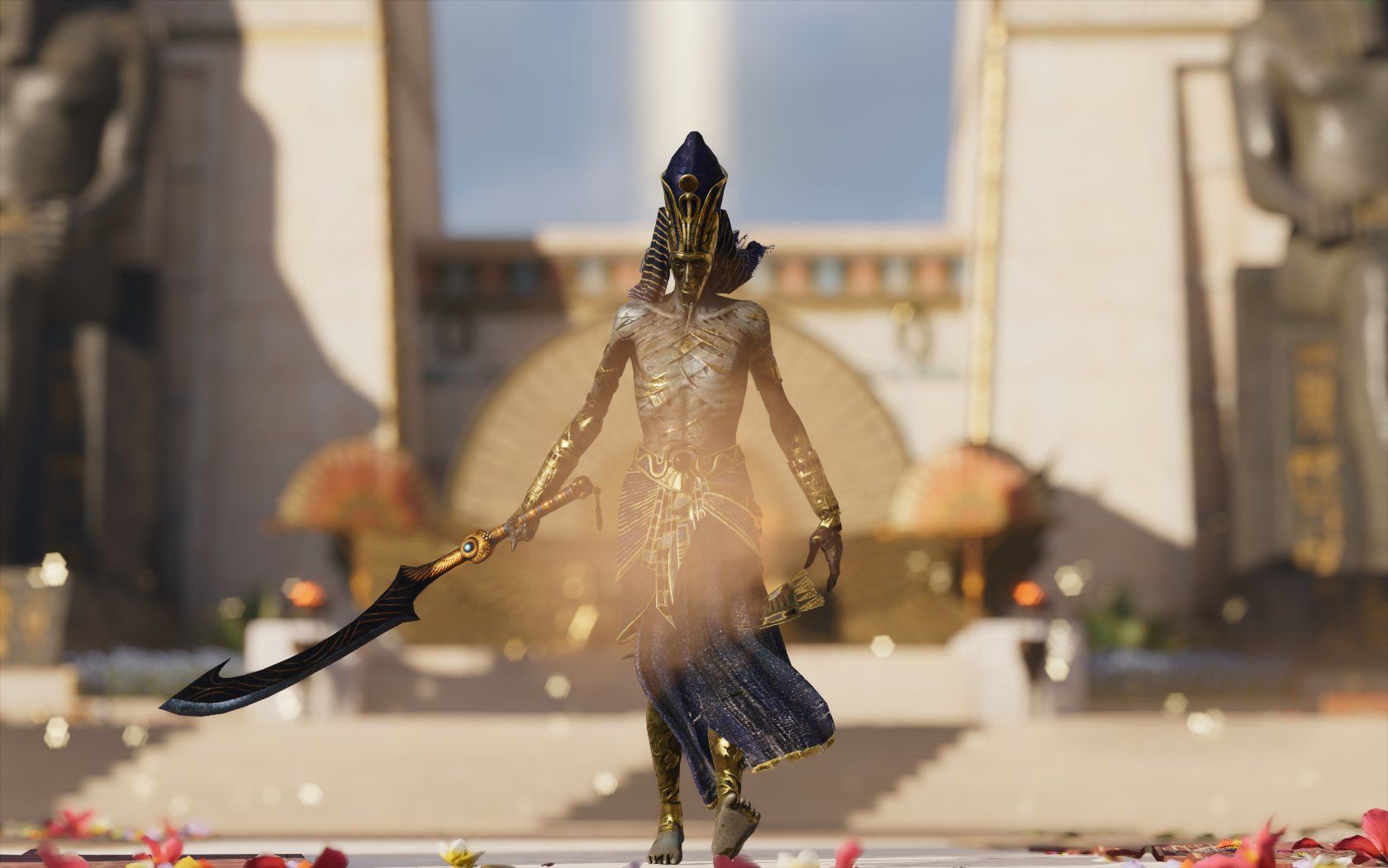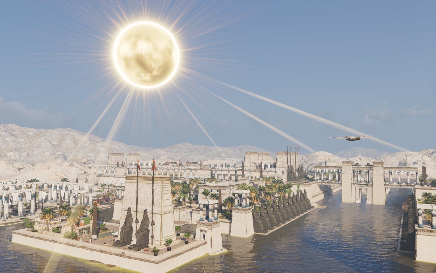 在所有死后世界中,阿肯那顿的领域最具颠覆性。这位历史上推行一神教改革的法老在游戏中拥有一个充满超现实色彩的太阳王国——巨大的金色日轮悬挂天际,光线如实体般倾泻而下,照耀着被水环绕的奇异神庙。