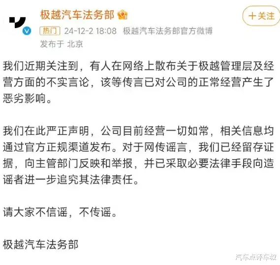 在负面消息愈演愈烈之时,极越汽车法务部开始下场辟谣,极越方面要表示:我们在此严正声明,公司目前经营一切如常,相关消息均通过官方正规渠道发布。对于网传谣言,我们已经留存证据向主管部门反映和举报,并已采取必要法律手段向造谣者进一步追究其法律责任。请大家不信谣,不传谣。