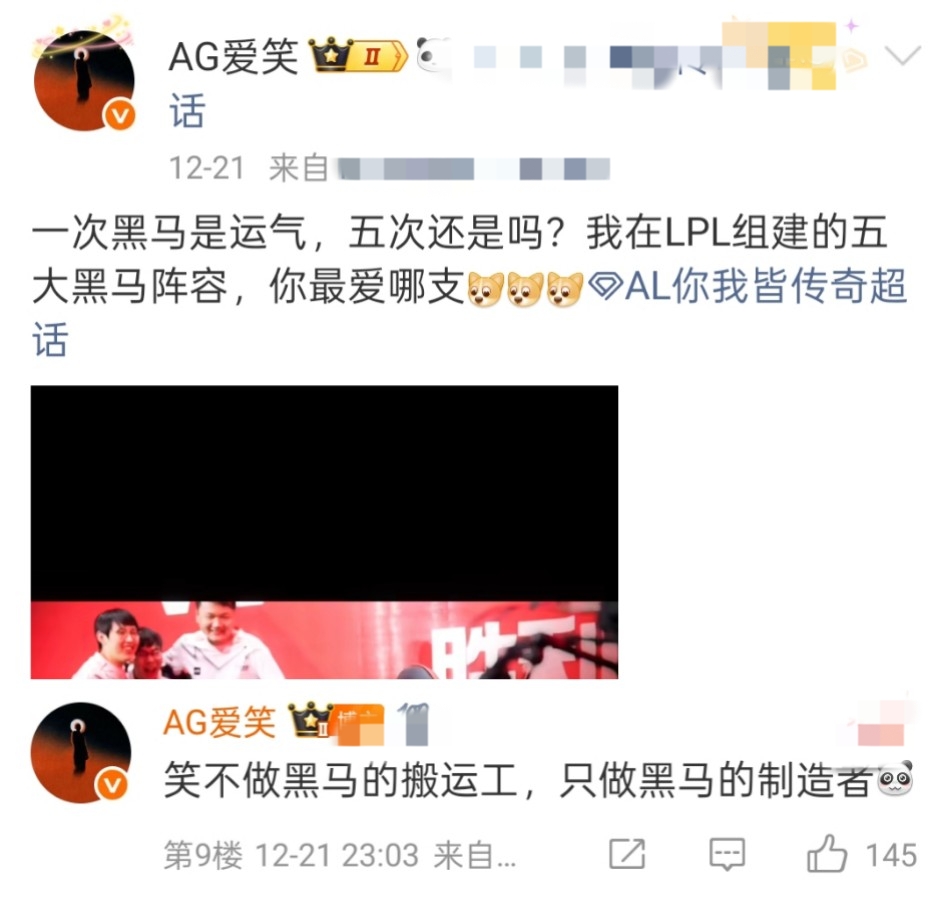 AL经理自夸行为引争议不过就在德玛西亚杯持续进行的同时,AL经理爱笑又开始狂刷存在感了!最近,AL经理爱笑发文自夸,直言自己职业生涯已经成功组建了五支黑马战队,这并非是运气能够解释的,随即更是在评论区自夸自擂“从来不做黑马搬运工,只做黑马制造者”。看到爱笑的这番迷惑行为后,AL粉丝纷纷劝其“闭麦”,毕竟由于爱笑此前的种种败人品言论,已经给团队带来很大的负面影响了。有粉丝愤怒地表示,AL最大的短板,恐怕就是经理爱笑了,转会期非但不补强阵容,反而为了维护Hope,跟粉丝互怼,然后还经常口出狂言,纯粹在给AL招黑。甚至有粉丝认为,AL之所以有数量庞大的黑粉,全是拜爱笑所赐!